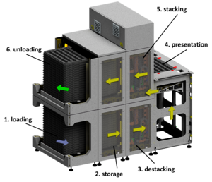 The TrayLine Stock extends the functions of the TrayLine Base by adding the option of stacking and destacking pallets. This means that entire stacks of pallets can be fed in while the system is running, saving space.