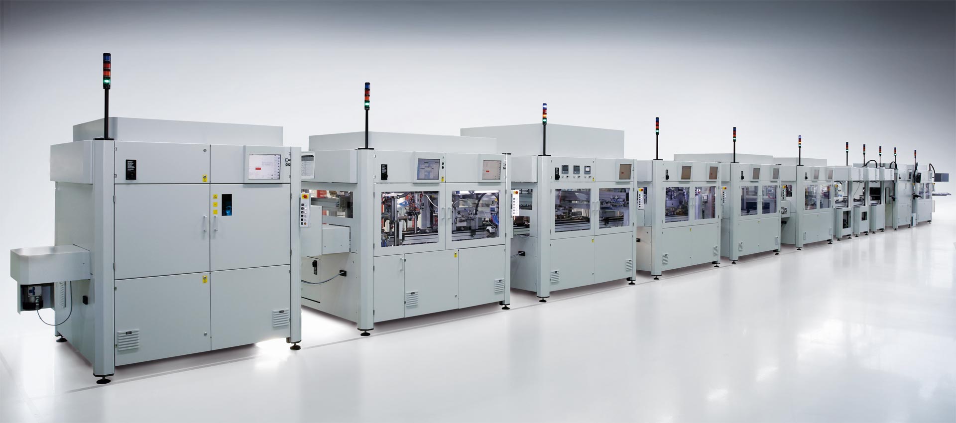 Semi-automatic assembly line for sensor units with in-line casting. The following processes are integrated: Caulking, laser soldering, casting, laser welding, leak testing. Cycle time < 12 seconds.