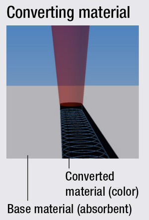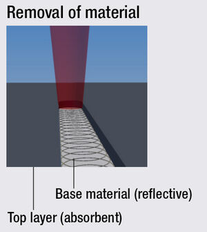 Los materiales recubiertos pueden etiquetarse eliminando la capa superior con el láser. Al eliminar la capa superior de metales recubiertos (por ejemplo, capas anodizadas) o pintados, el rayo láser no interactúa con el material base, sino principalmente con la capa superior. Es reflejado por el material base.