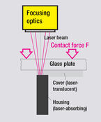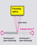 With this method, the laser beam shines through the upper joining partner and is absorbed on the surface of the lower joining partner. This leads to melting of the absorbing partner. The laser-transparent joining partner is also melted locally to a very limited extent due to the surface contact of the parts pressed together.