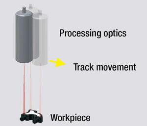 The Wolf rotation optics (see image) enable a radially rotating laser beam. The workpiece can be stationary. Alternatively, the rotation optics can be set up for an axially rotating laser beam.