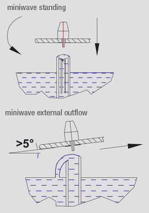 The circuit board is dragged over a mini-shaft against the flow direction of the solder. This allows a larger area to be soldered on a PCB. To avoid solder bridges between two neighboring solder joints, the solder must “break off” in a defined manner. For this purpose, the circuit board is dragged at an angle greater than 5°. To reduce oxide formation at the nozzle outlet and improve soldering, the nozzle is flushed with nitrogen, as with the standing mini wave.